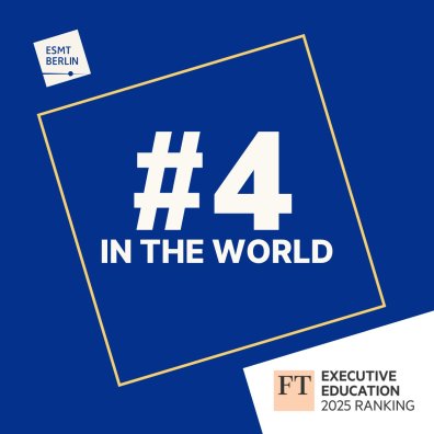 Die ESMT Berlin wurde im Financial Times Executive Education Ranking 2025 weltweit auf Platz 4 für maßgeschneiderte Programme eingestuft. Damit gehören wir bereits im vierten Jahr in Folge zur globalen Top 10 – ein Beleg für das anhaltende Engagement und die Exzellenz unseres Teams. In Deutschland bleiben wir zudem die Nr. 1 in der Executive Education.